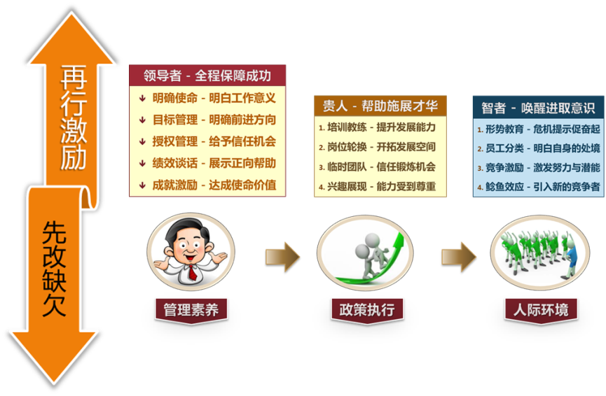 ▲ 二步走,穩(wěn)妥有效。首先強調(diào)優(yōu)化管理不欠賬-以工作方式,減少對員工熱情的傷害;再在物質(zhì)保障下,目標激勵/非物質(zhì)激勵,保障員工的穩(wěn)定性,設計有效的激勵方法,提升員工執(zhí)行動力,提升績效。